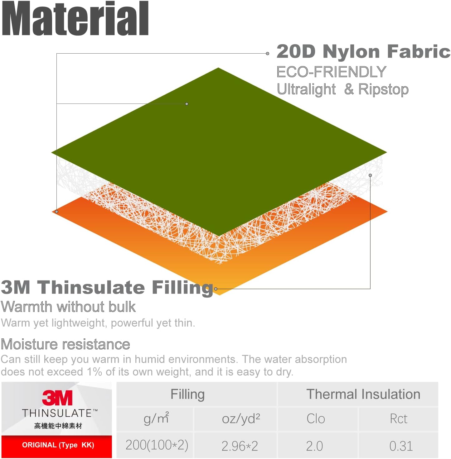 3M Thinsulate Insulation Filling, warm yet lightweight, powerful yet thin. It helps trap body heat, while allowing moisture to escape; Featherless, ECO-FRIDENDLY, a kinder alternative to feathers; Water Resistant, 100% Polyester, synthetic fibers absorb less than 1% of their weight in water; 20D nylon fabric, soft, skin-friendly, ultralight, durable, and windproof